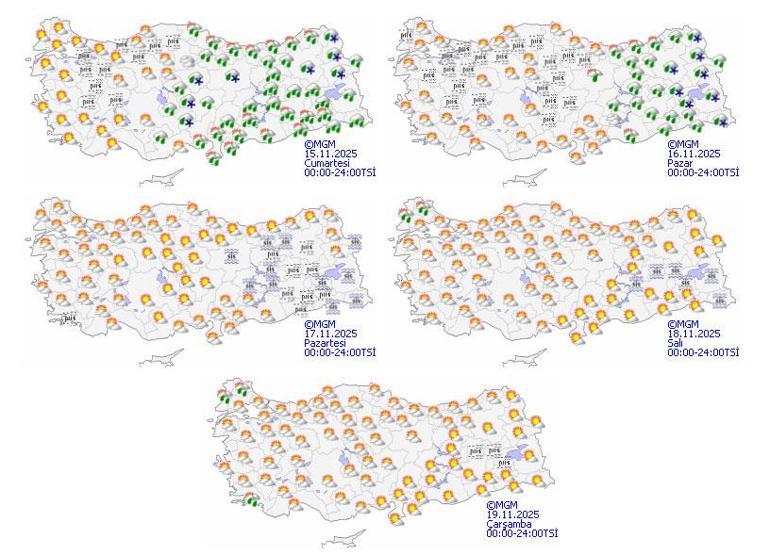 Meteoroloji Genel Müdürlüğü tarafından yapılan tahminlere göre: Ülkemiz genelinin parçalı ve çok bulutlu, İç Anadolu’nun doğusu, Doğu Akdeniz, Orta ve Doğu Karadeniz, Doğu ve Güneydoğu Anadolu ile Sinop çevrelerinin yağmur ve sağanak yağışlı, İç Anadolu’nun doğusunun yüksekleri, Orta ve Doğu Karadeniz’in iç kesimlerinin yüksekleri ile Doğu Anadolu’nun yükseklerinin karla karışık yağmur ve yer yer kar yağışlı geçeceği tahmin ediliyor. Yağışların; Doğu Anadolu’nun güney ve batısı, Güneydoğu Anadolu’nun kuzey ve doğusu, Ordu, Giresun, Tokat, Sivas ve Kahramanmaraş çevreleri ile Hatay kıyılarında yerel kuvvetli olması bekleniyor. Gece ve sabah saatlerinde Marmara, İç Ege, Batı Akdeniz’in iç kesimleri, Batı Karadeniz’in iç kesimlerinde pus ve yer yer sis bekleniyor. Rüzgarın, Orta Akdeniz’de kuzeyli yönlerden, Güneydoğu Anadolu’nun doğusunda ise güneyli yönlerden kuvvetli olarak (50-70 km/saat) esmesi bekleniyor. Güneydoğu Anadolu’nun doğusunda Toz taşınımı görüleceği tahmin ediliyor.